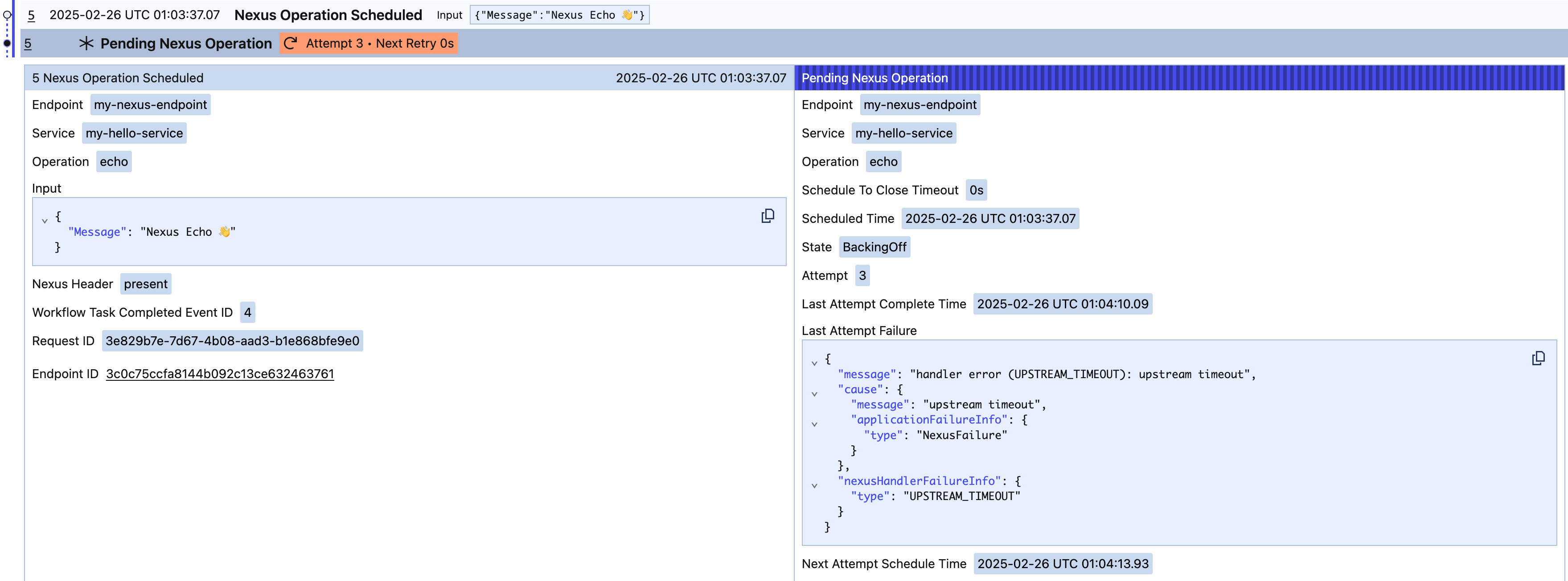 Similar to pending Activities, pending Nexus Operations are displayed in the Workflow details page and using: temporal workflow describe.
